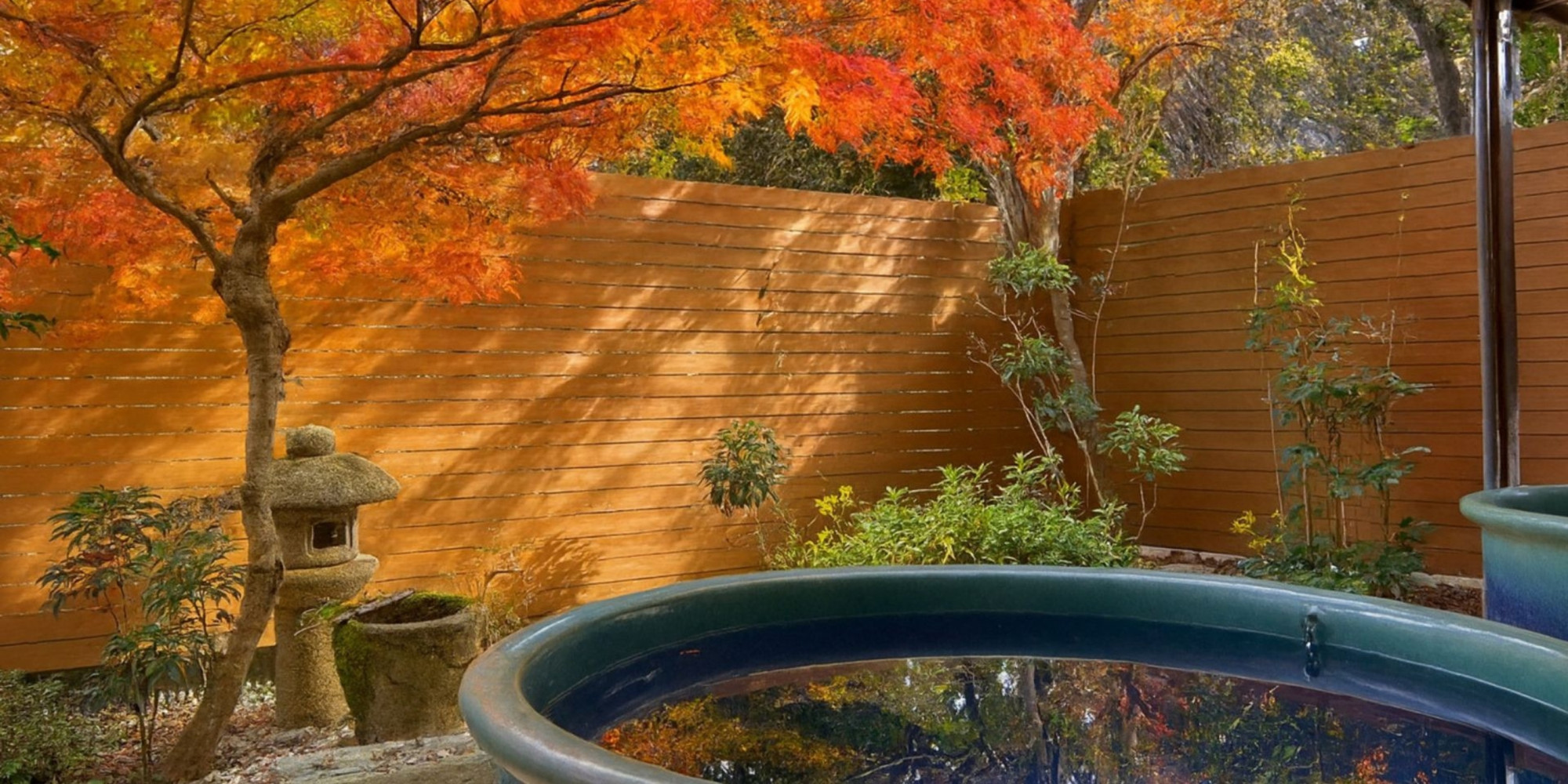 信楽焼の露天風呂では、四季折々に表情を変える自然美を楽しめます。