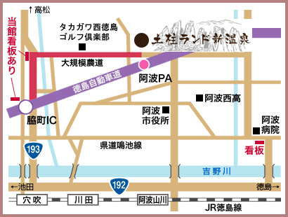 無料駐車場/高松空港から車で45分/脇町ICから車で7分/阿波山川駅から車で13分/高速バス阿波PA下りバス停徒歩5分