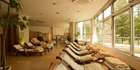 リクライニングチェアが並ぶ休憩スペース。