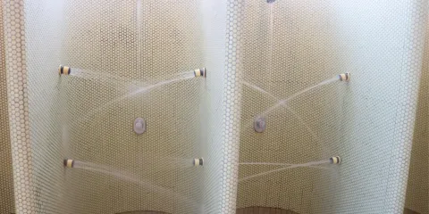 頭上から勢いよくお湯が注がれる打たせ湯。
