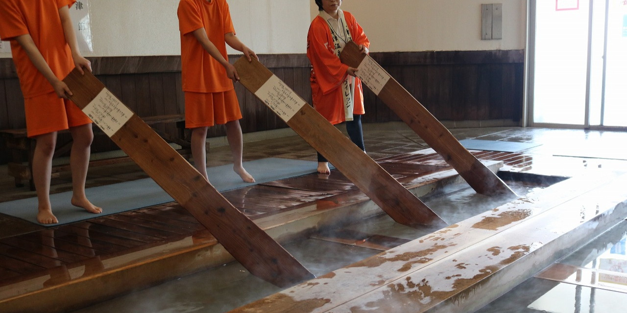プール&温泉 テルメテルメ内、わたの湯では、草津温泉の伝統的な集団入浴法に倣った「湯もみ」を体験いただけます。