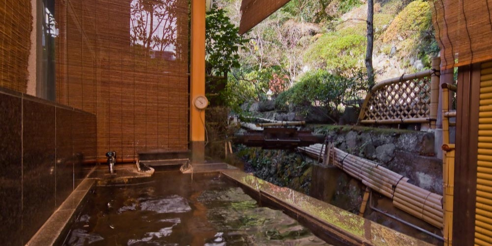 かけ流しの温泉を供給した、専用露天風呂の付いた客室。