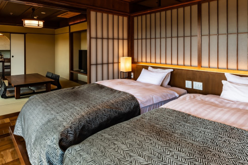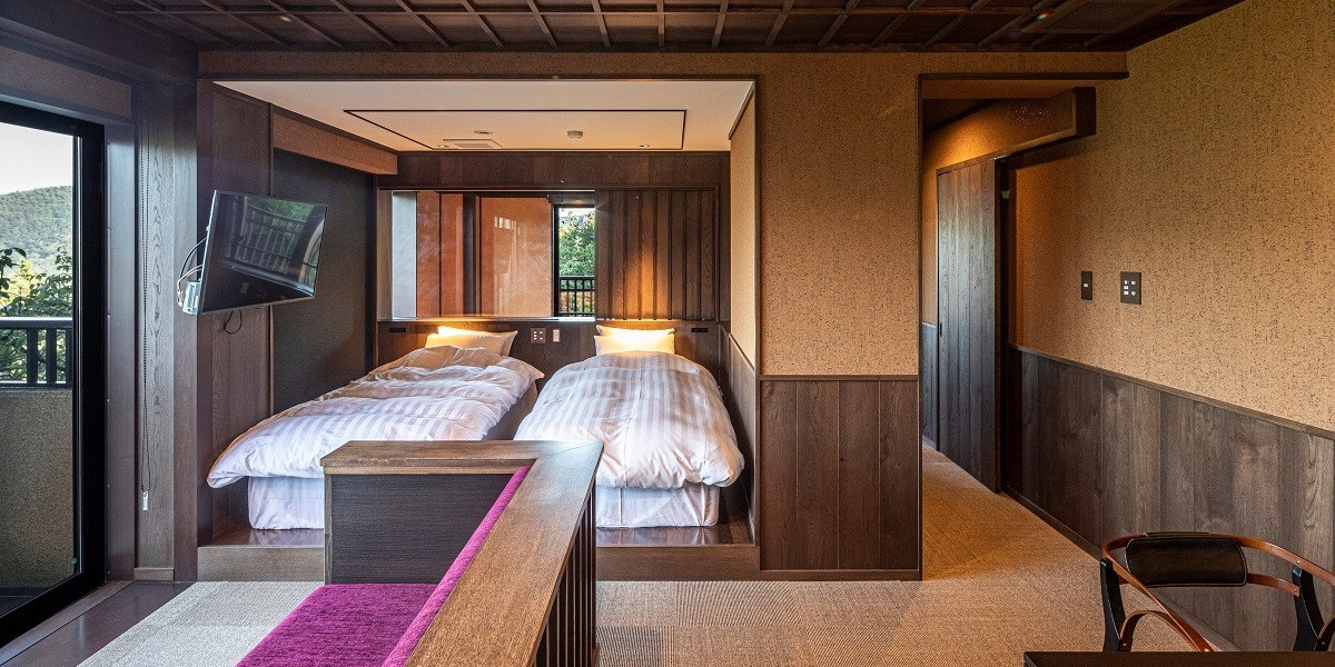 48.05㎡にはベッド2台・ソファー・ダイニングテーブル・半露天風呂を備えた客室です。