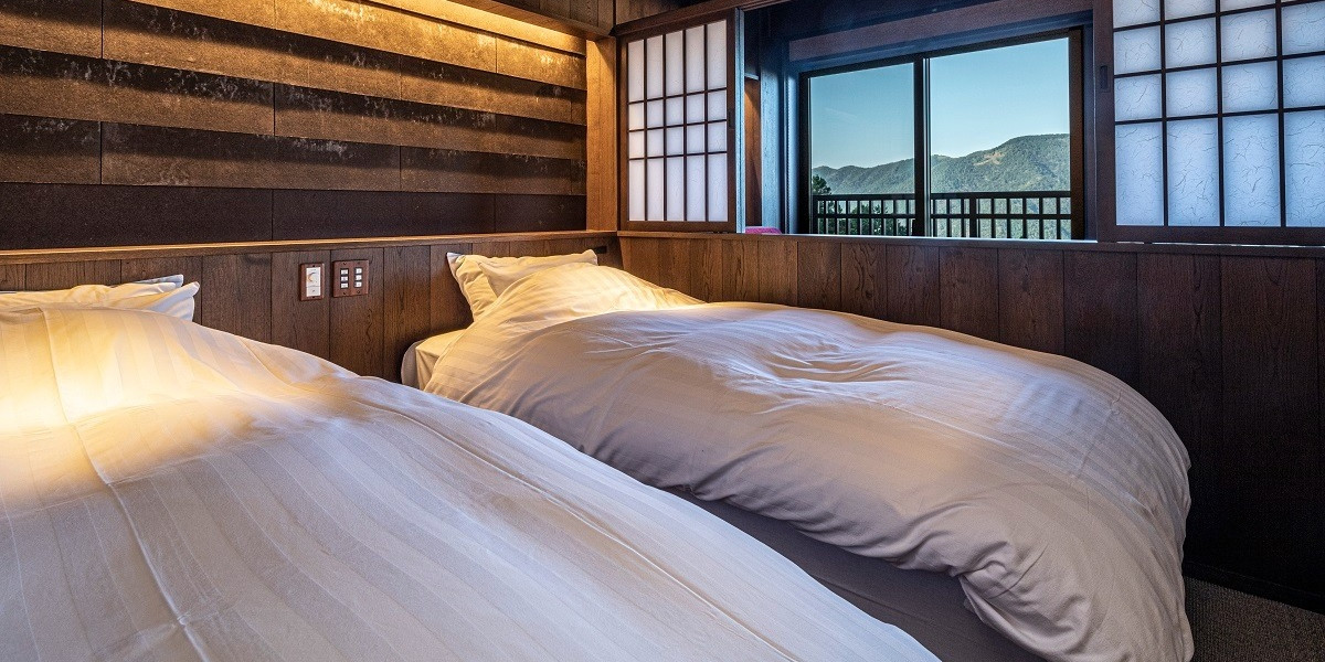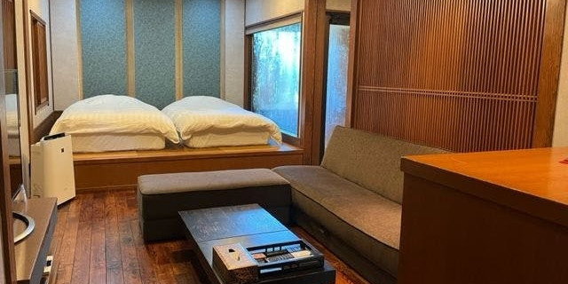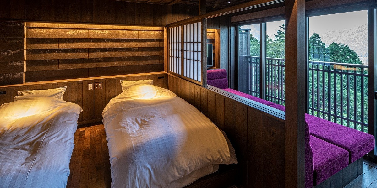 39.4㎡にはベッド2台・ソファー・半露天風呂、そして湯上りバーを備えた当館唯一の客室です。