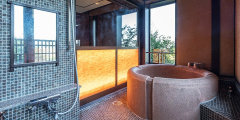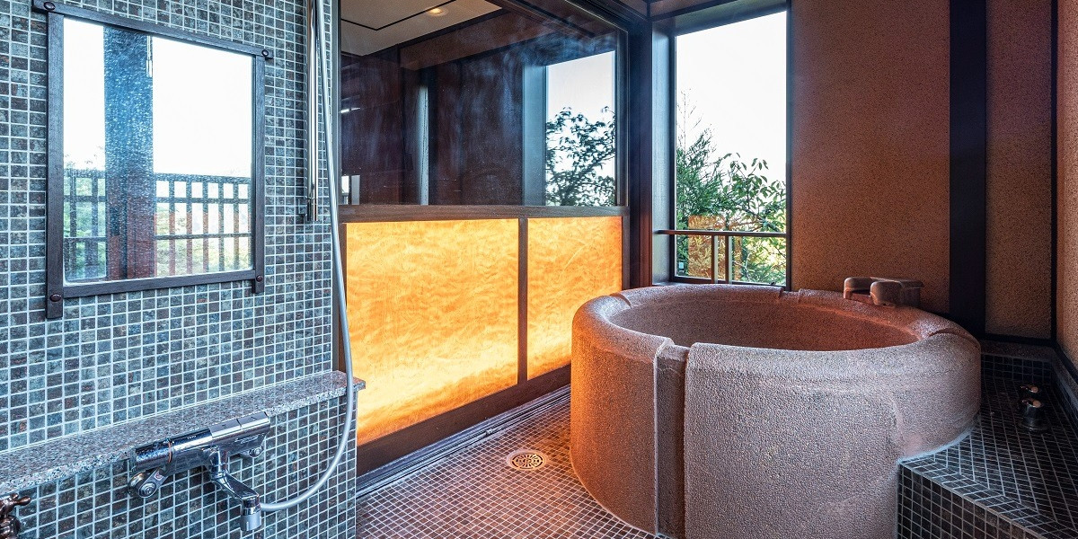 石造りの円型の浴槽をご用意しております。浴槽の上部には一部檜を使用しておりますので、香りがほのかに漂います。身体で天然温泉を感じ、香りで檜の香りを感じ、目で箱根の雄大な山々を感じる。日々の喧騒を忘れてお寛ぎ頂ける、まさに極上の癒し空間です。