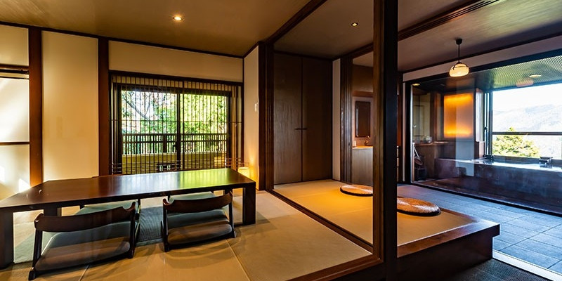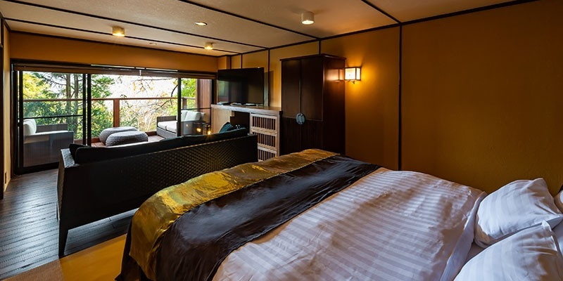 開放感ある露天風呂付きの客室はゆったりとお寛ぎ頂ける設えにて、皆様をお迎えいたします。