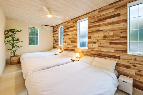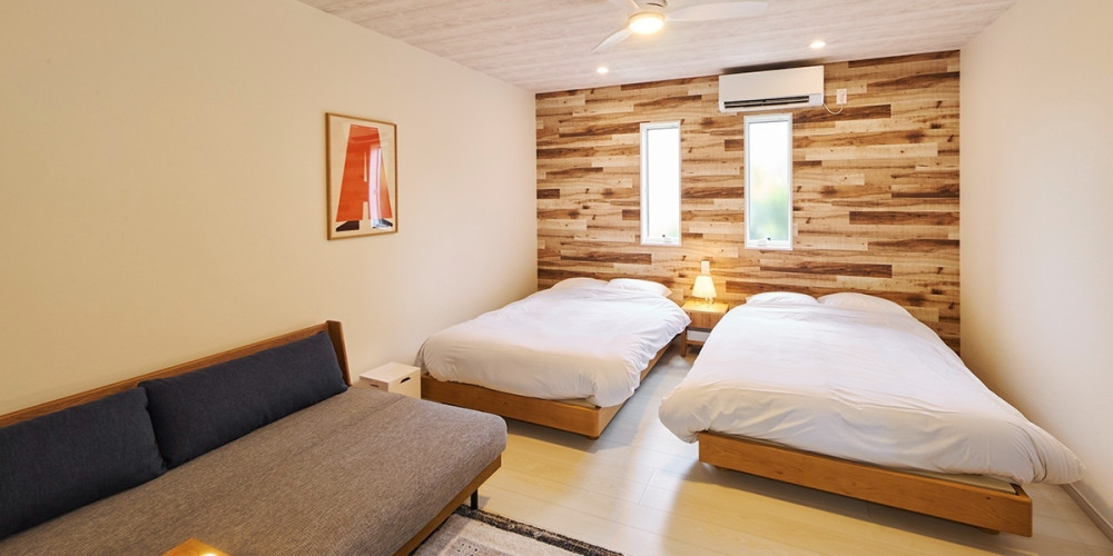 明るく温かみのある雰囲気のベッドルーム。壁の一面には木目調のアクセントウォール、2つのベッドをご用意しています。部屋の左側には、落ち着いた色調のソファが配置されており、くつろぎのスペースが確保されています。天井のファンとシンプルなインテリアが、清潔感と快適さを演出しており、リラックスできる空間を提供しています。