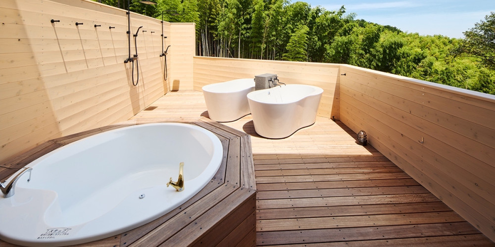 緑豊かな森林を背景にした開放的な露天風呂。ウッドデッキの上に配置された白い浴槽が3つあり、開放感のあるなかでバスタイムを楽しめます。