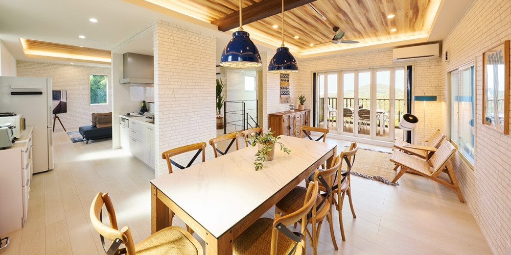 奥には広々としたダイニングスペースが広がり、全体的にリラックスした西海岸風のインテリアが特徴です。