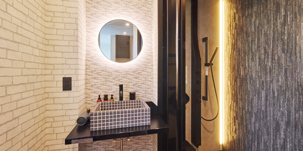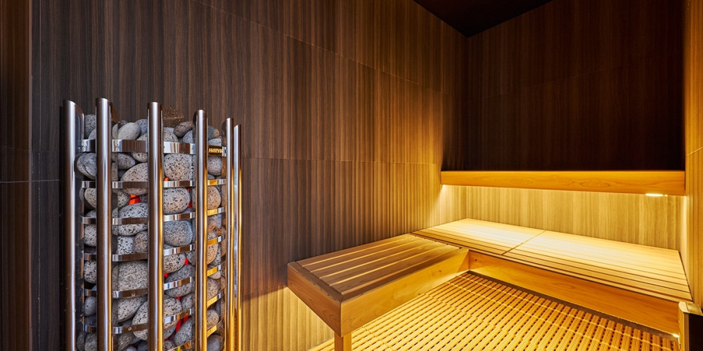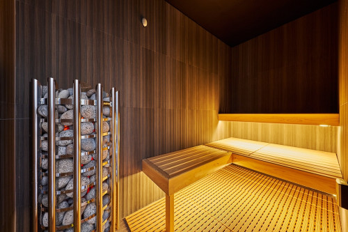 温かい照明が心地よさを演出するモダンなサウナルーム。