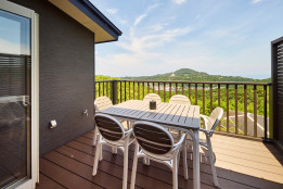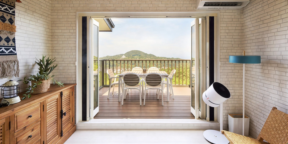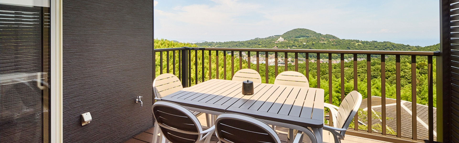 展望リビングやデッキから、緑に包まれた山々と広がる青空、相模湾や初島の美しい景色、夜には豊かな自然が紡ぎだす音色と夜風を感じながら街の灯りを一望できるなど、訪れる宿泊者の方々に非日常な時間を提供します。