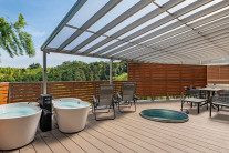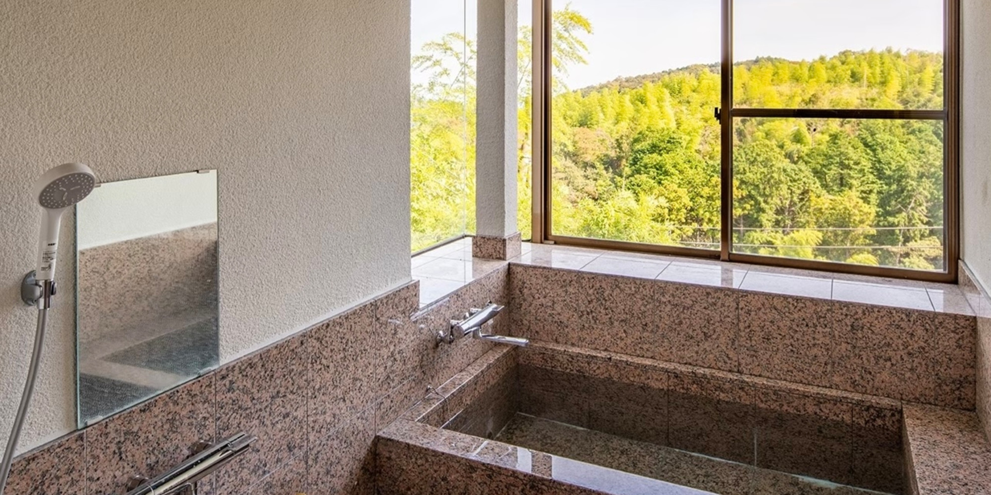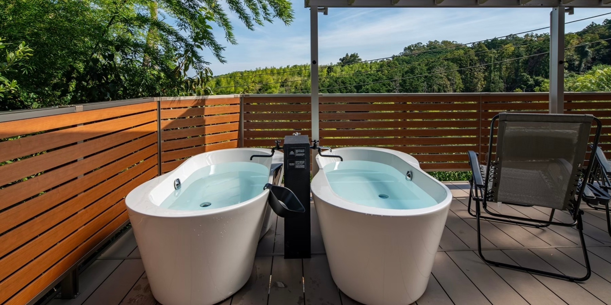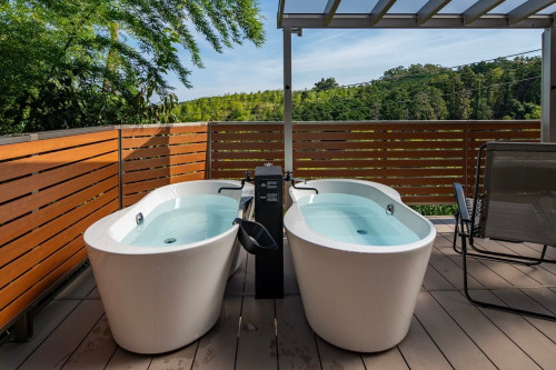 屋外ウッドデッキに2基の露天の浴槽と、緑に囲まれた景色をお楽しみいただける客室内風呂をご用意。
