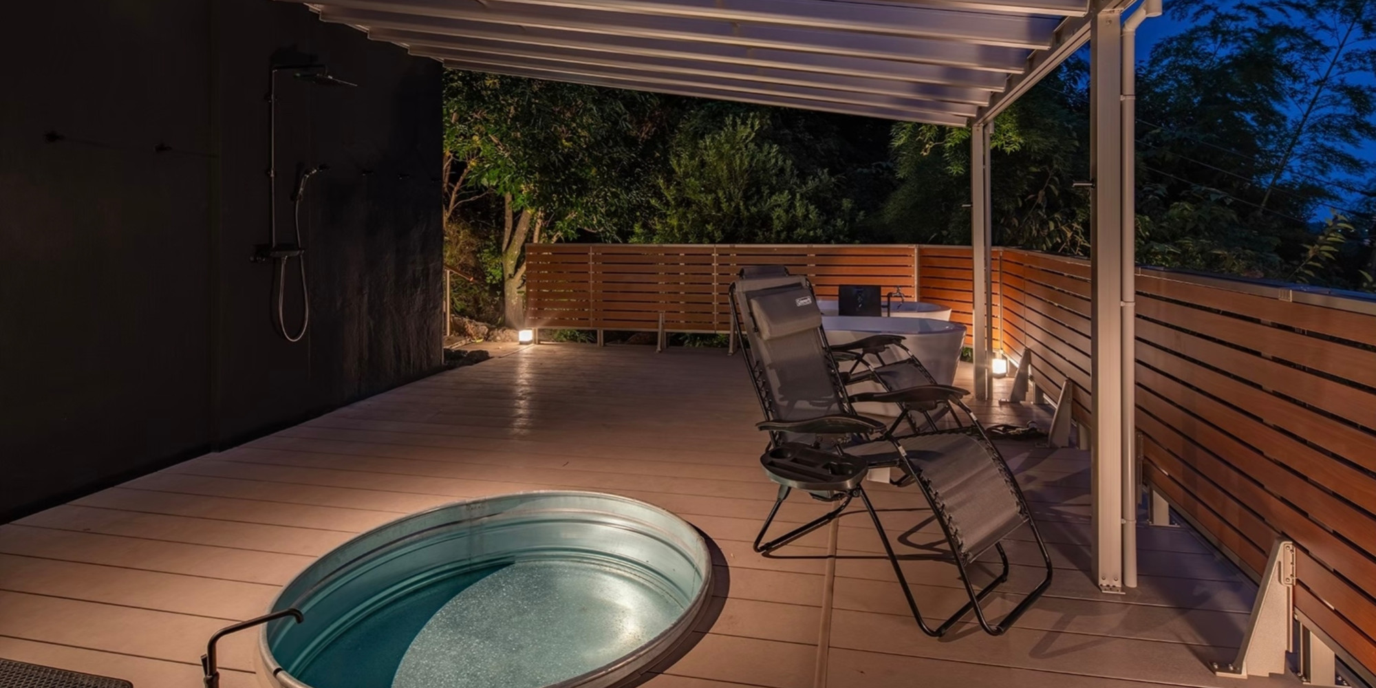 サウナの後はオーバーヘッドシャワーで汗を流し、地下から汲み上げられた冷たい天然水で冷水浴を。隣にはインフィニティチェアもご用意しております。