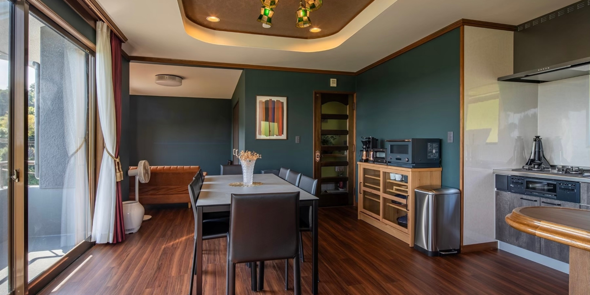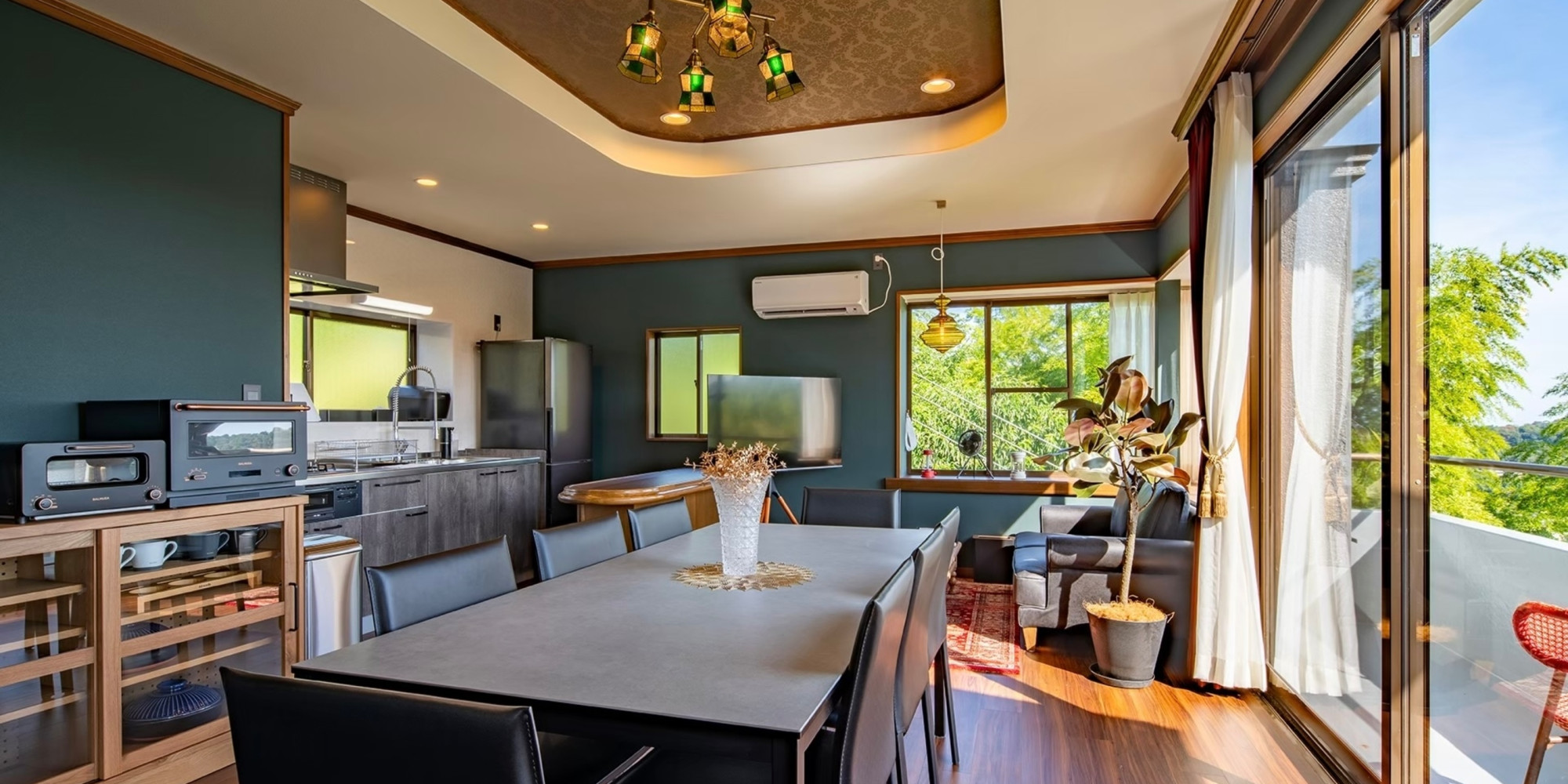 伊東の森、空、海を見渡すダイニング。大切な方とのお食事やティータイムをお楽しみください。