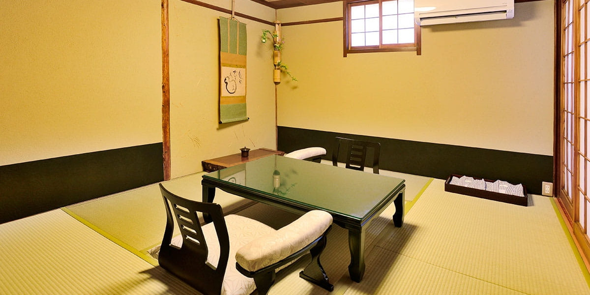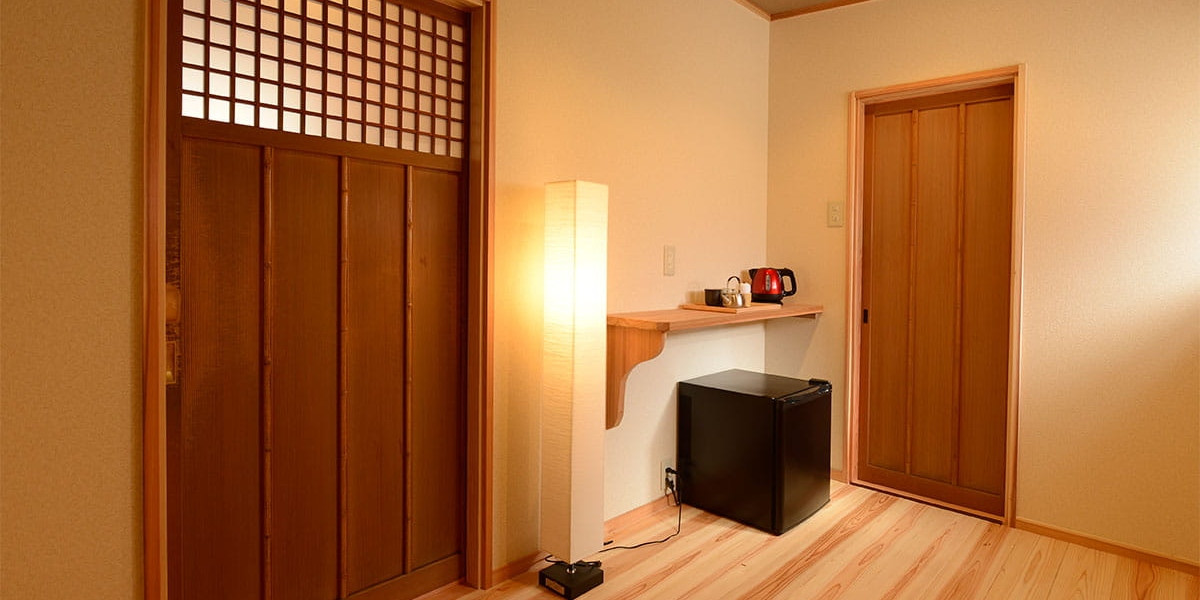 茶室のような趣きの1階客室「月」。こじんまりとした六畳の和室とバストイレ洗面室が備わっております。