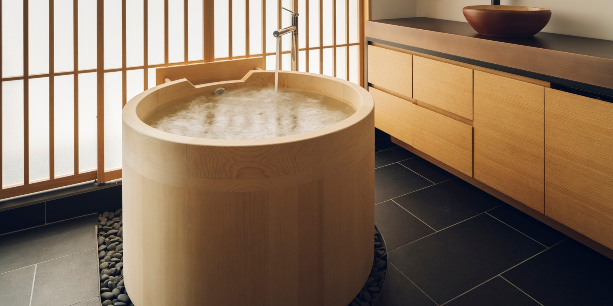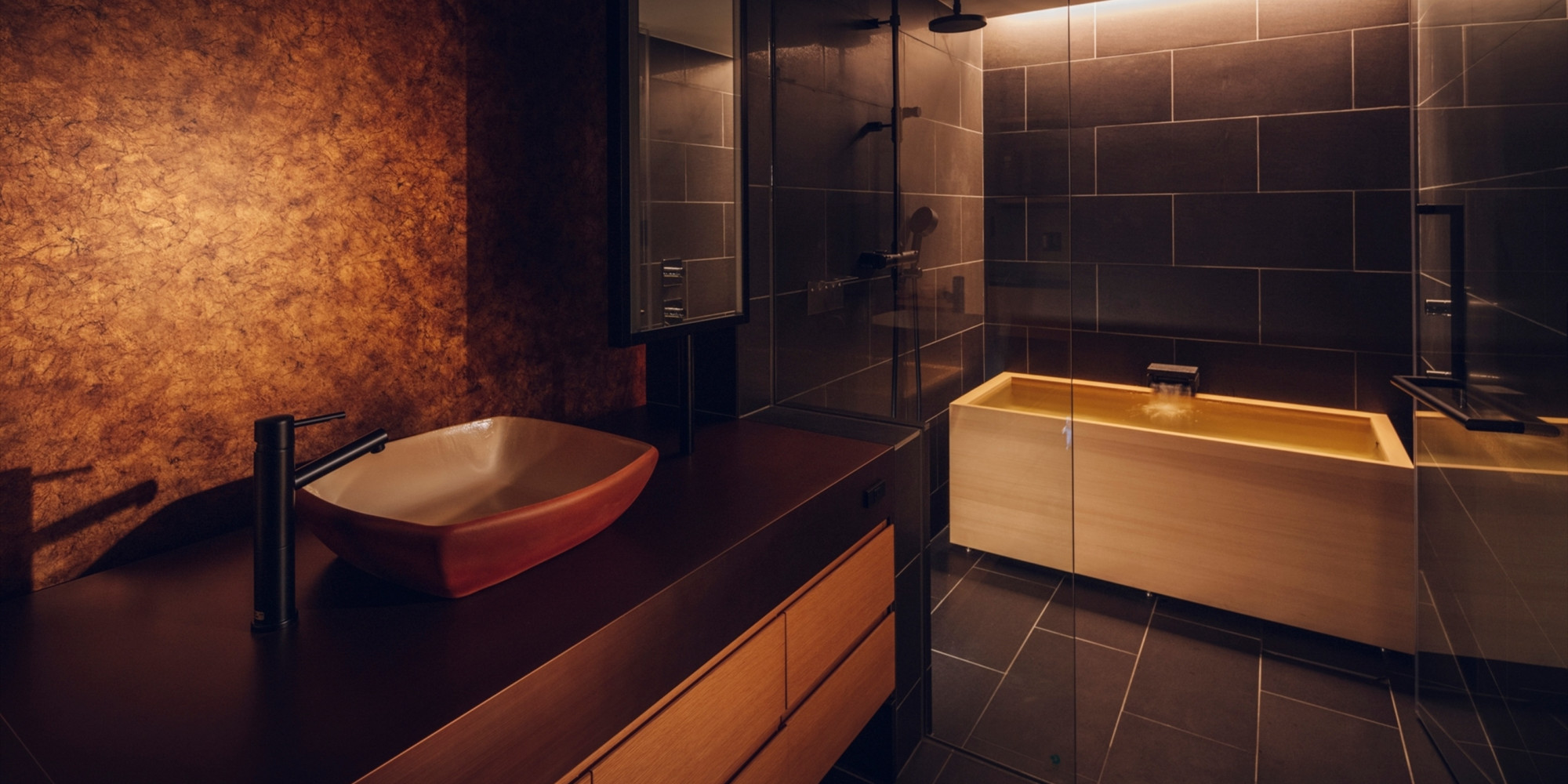 自然溢れる桧葉風呂と便利な設備、一歩先の滞在