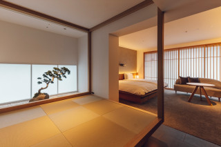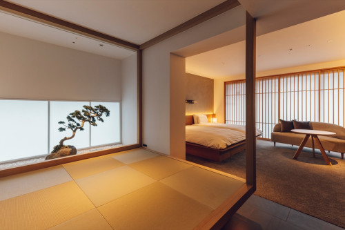 檜葉風呂付。50平米の客室には坪庭を臨める畳スペースがあり檜葉風呂からもその眺望がたのしめます。