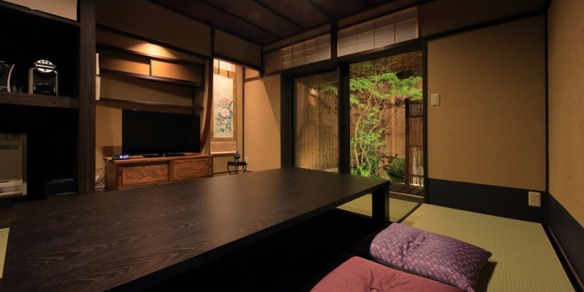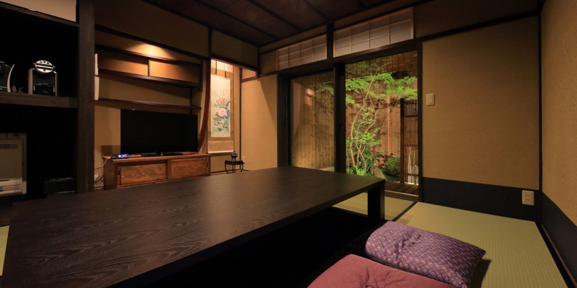 居間では伝統の職人技で仕立てた「洛中高岡屋」の京座布団に座りながら、掘りごたつに足を伸ばしゆったりとお過ごしいただけます。