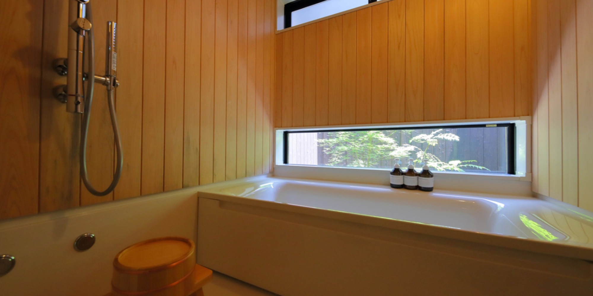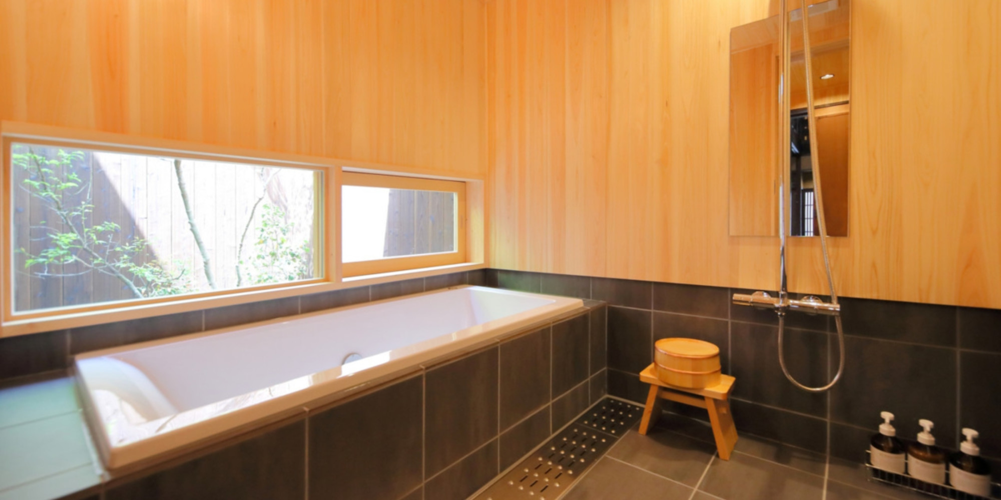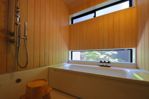 木の香りが広がる浴室からは季節ごとに彩りの変わるお庭を眺めることができ、ちょっとした露天風呂気分を味わっていただけます。