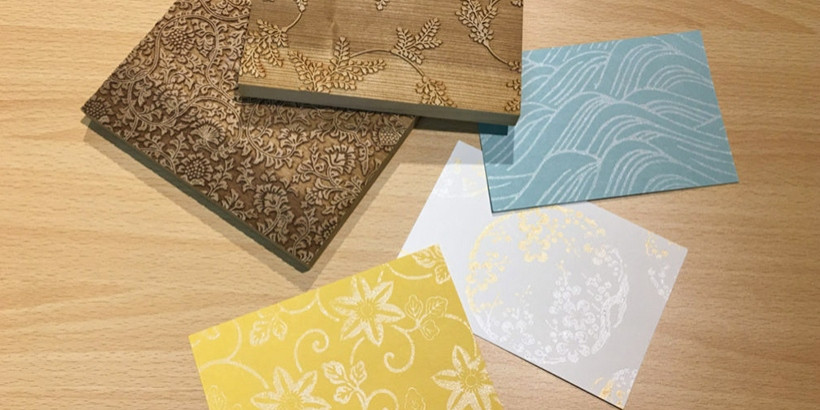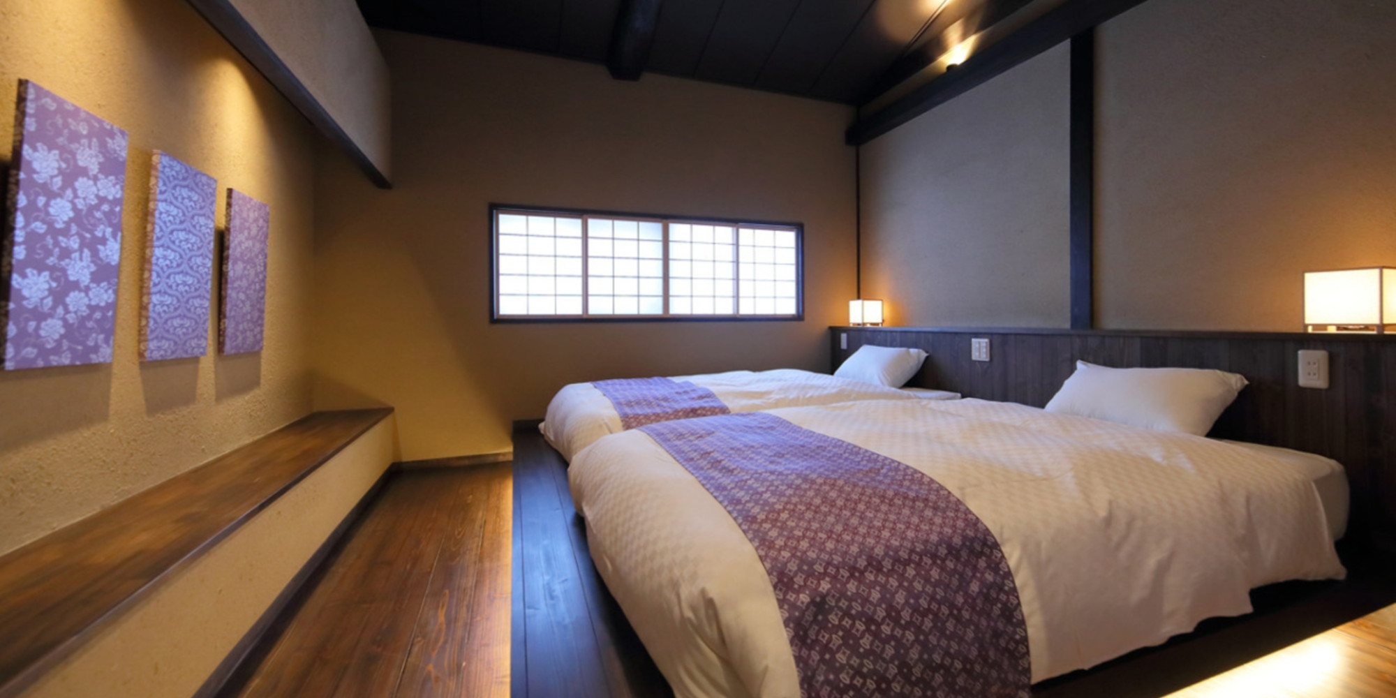 壁にかかった京都の伝統工芸品「京からかみ」のパネルの模様は、朝日に照らされるとキラキラと輝いて美しい景色を見せてくれます。
