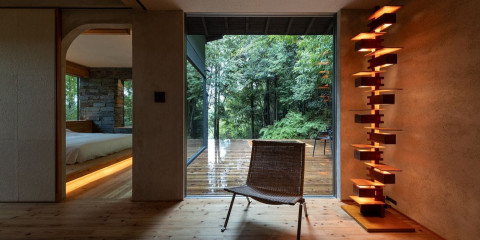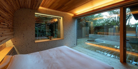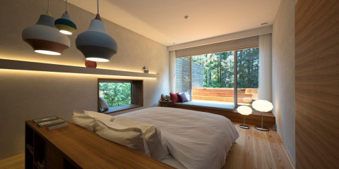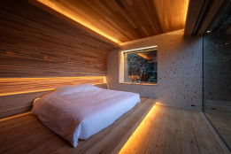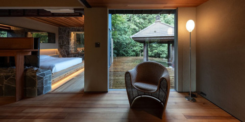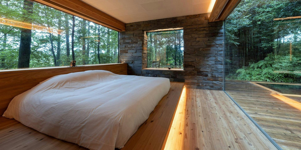 大人の隠れ家のような然は目の前に森、ベット横のヌックからは朝日を感じることができるお部屋。