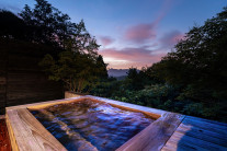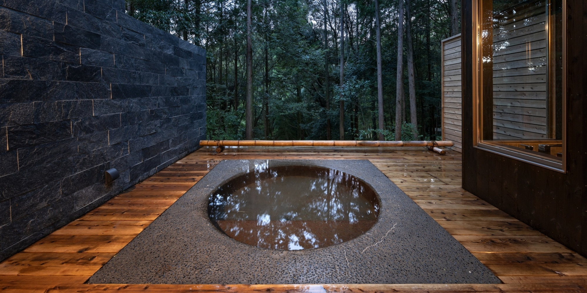 当館で唯一、屋根を備えた石造りの露天風呂。視線の先に広がるのは、しっとりとした山の緑。雨音を聞きながら、あるいは陽射しを避けながら、心をほどく時間を。