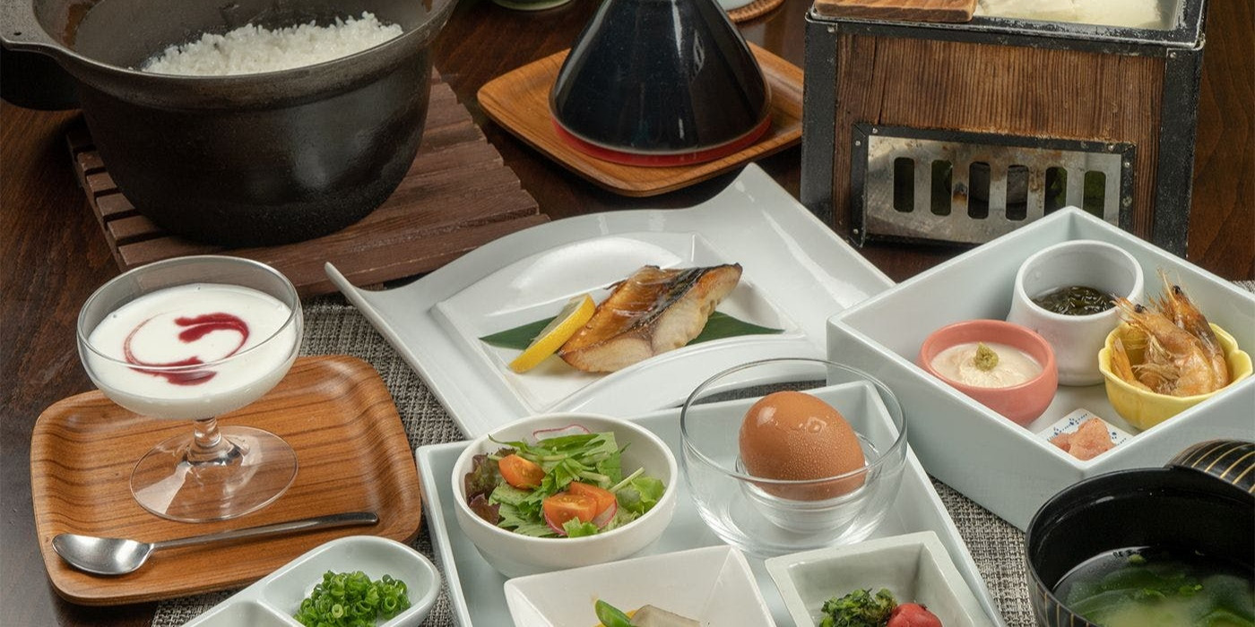 お時間に合わせて南部鉄器で炊き上げた「さがびより」、自家源泉を使用した「温泉湯豆腐」等ご飯に合わせた和食でヘルシーなメニュー。