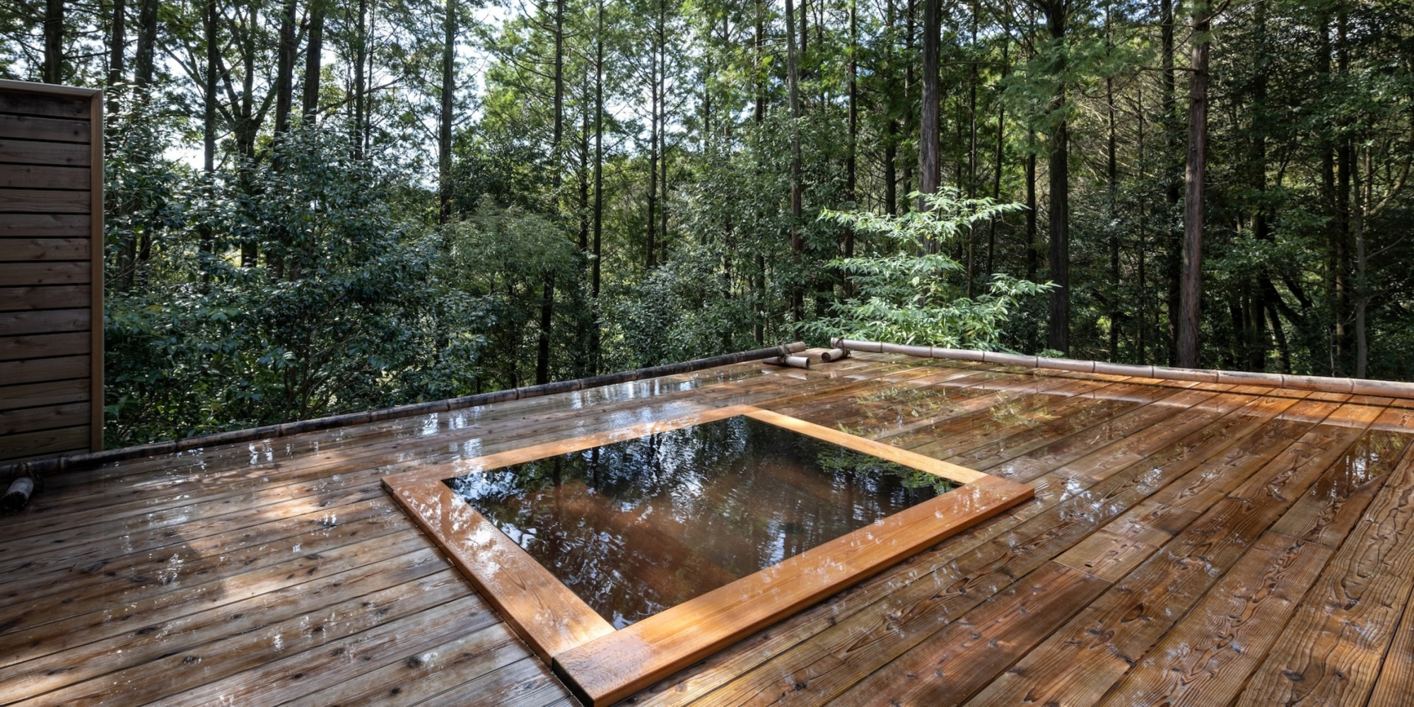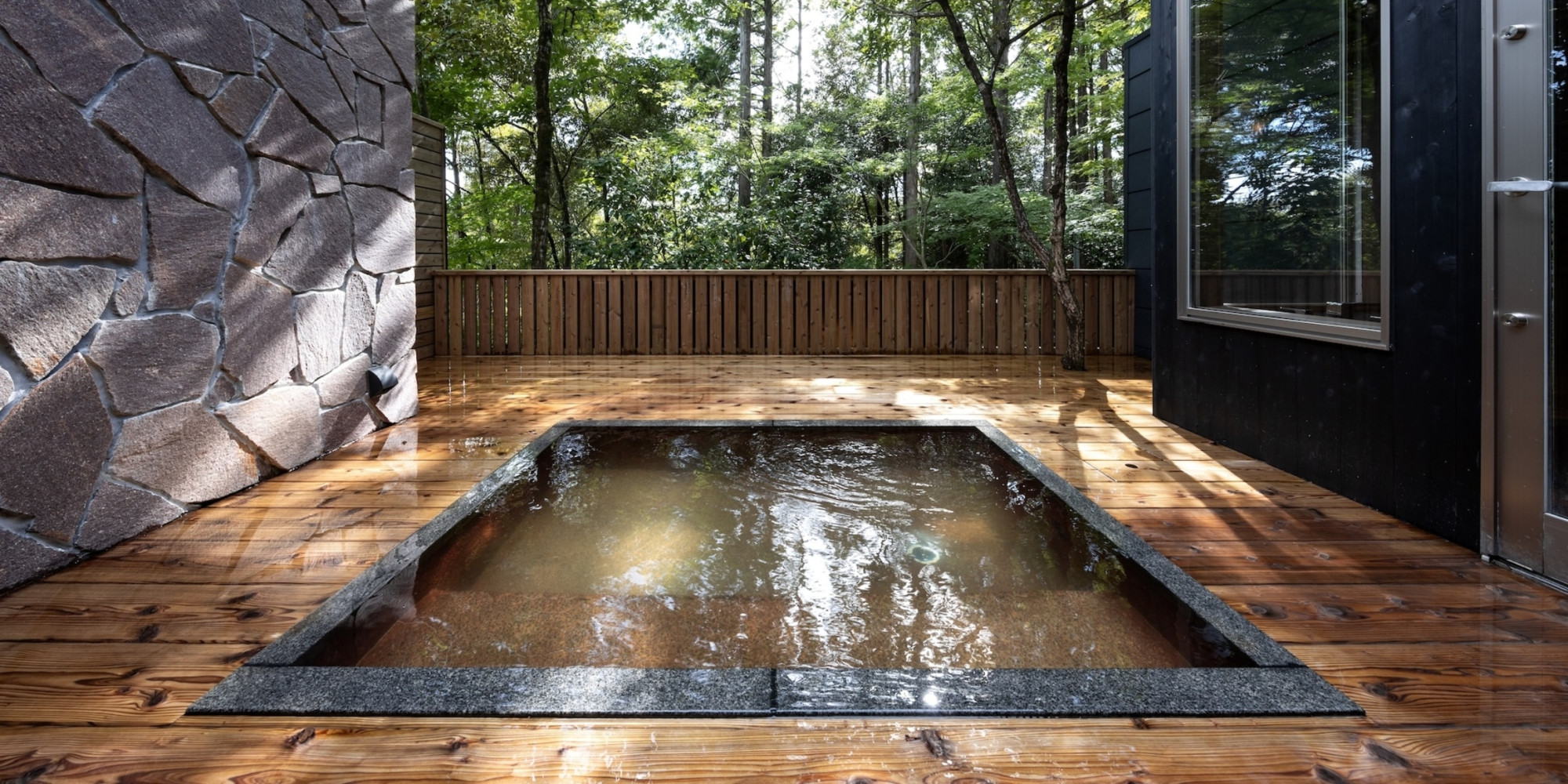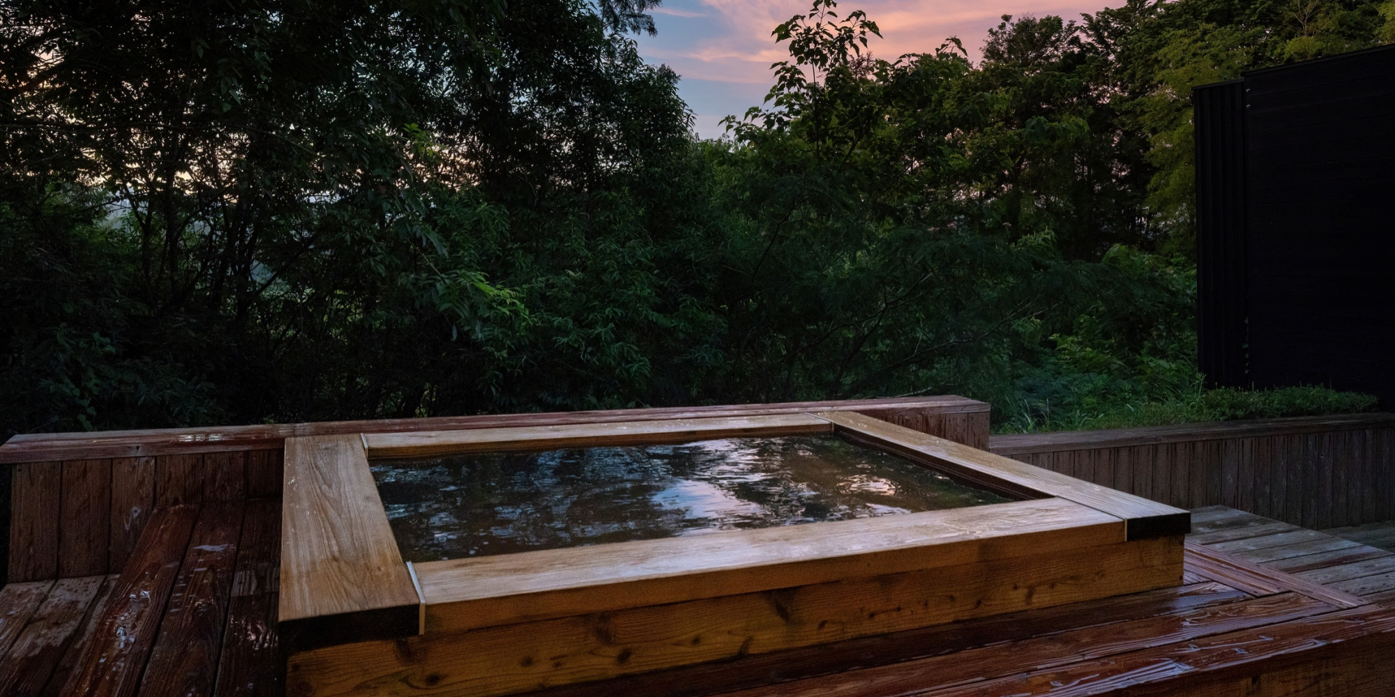 当館で唯一のジャグジー付きの露天風呂。木々に囲まれた開放的な湯処で、自然と湯のぬくもりが響き合う、癒やしのひとときをご堪能ください。