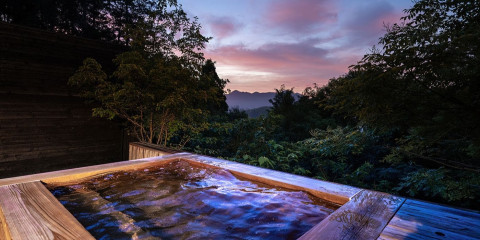 11室に趣の異なる露天風呂。奥武雄温泉は「純重曹泉」。トロトロの美肌効果のあるお湯です。かけ流しはできませんが、毎日全湯入れ替え、循環による保温機能で滞在中いつでもお愉しみいただけます。