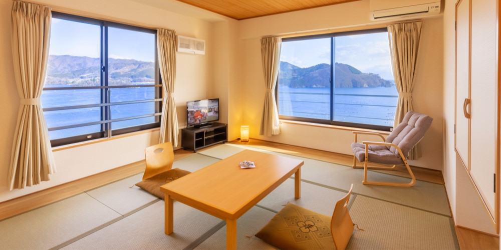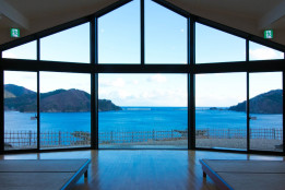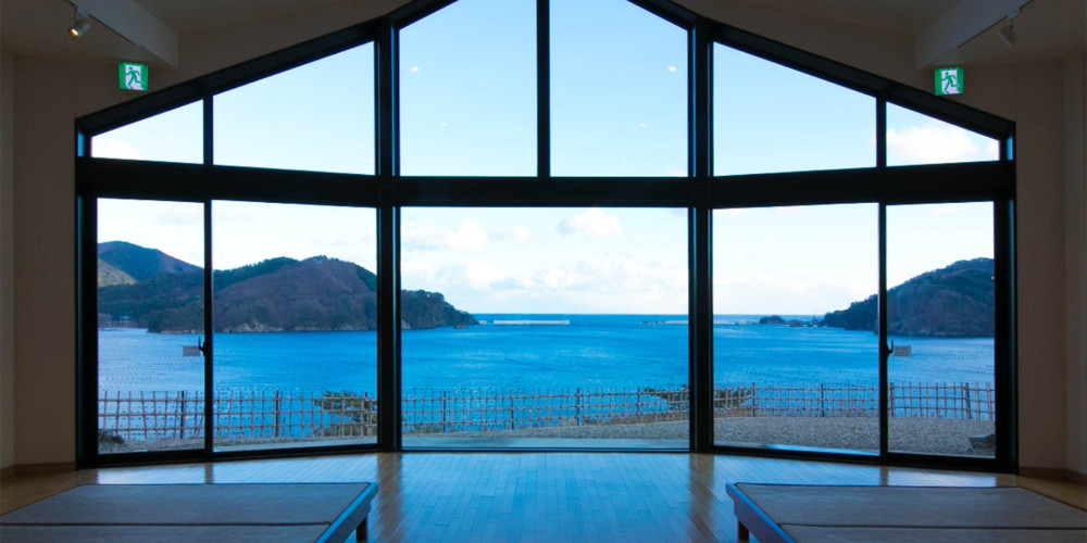 大きな窓から絵画のような大船渡湾の景色がお出迎え。