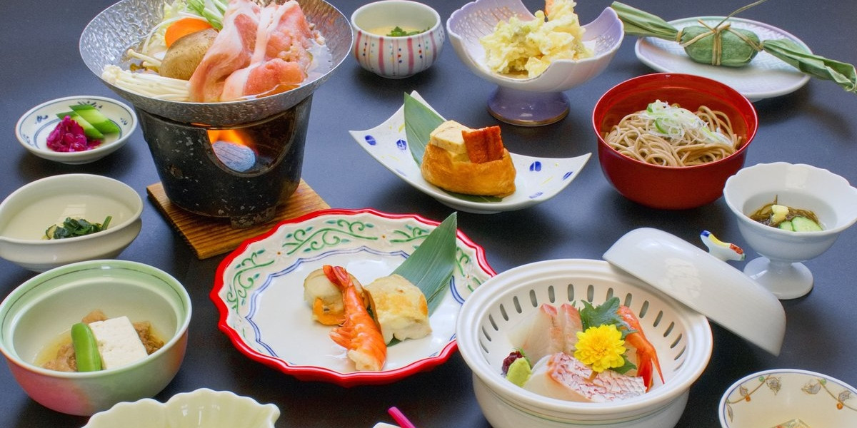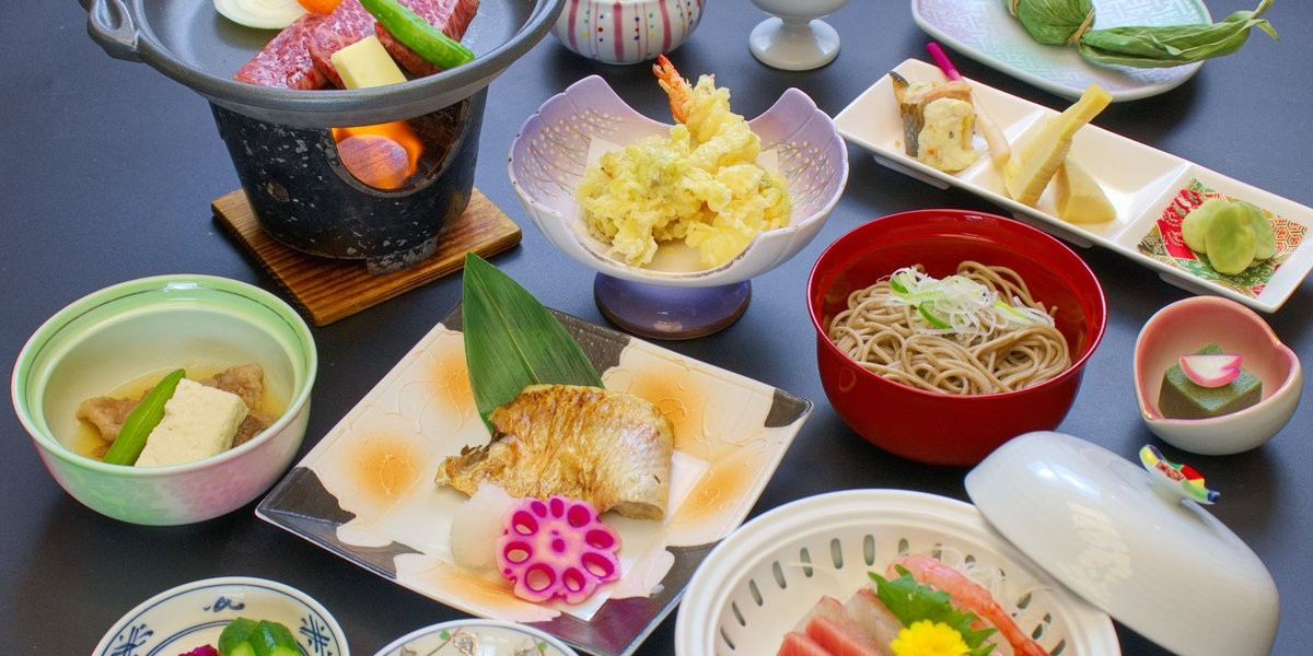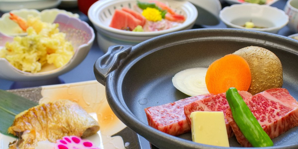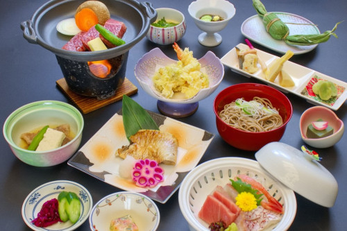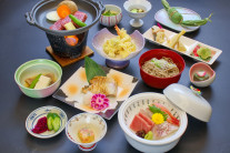 ご夕食は新鮮な山海の恵みや郷土料理などをハーフ会席とライブキッチンでご堪能いただけます。