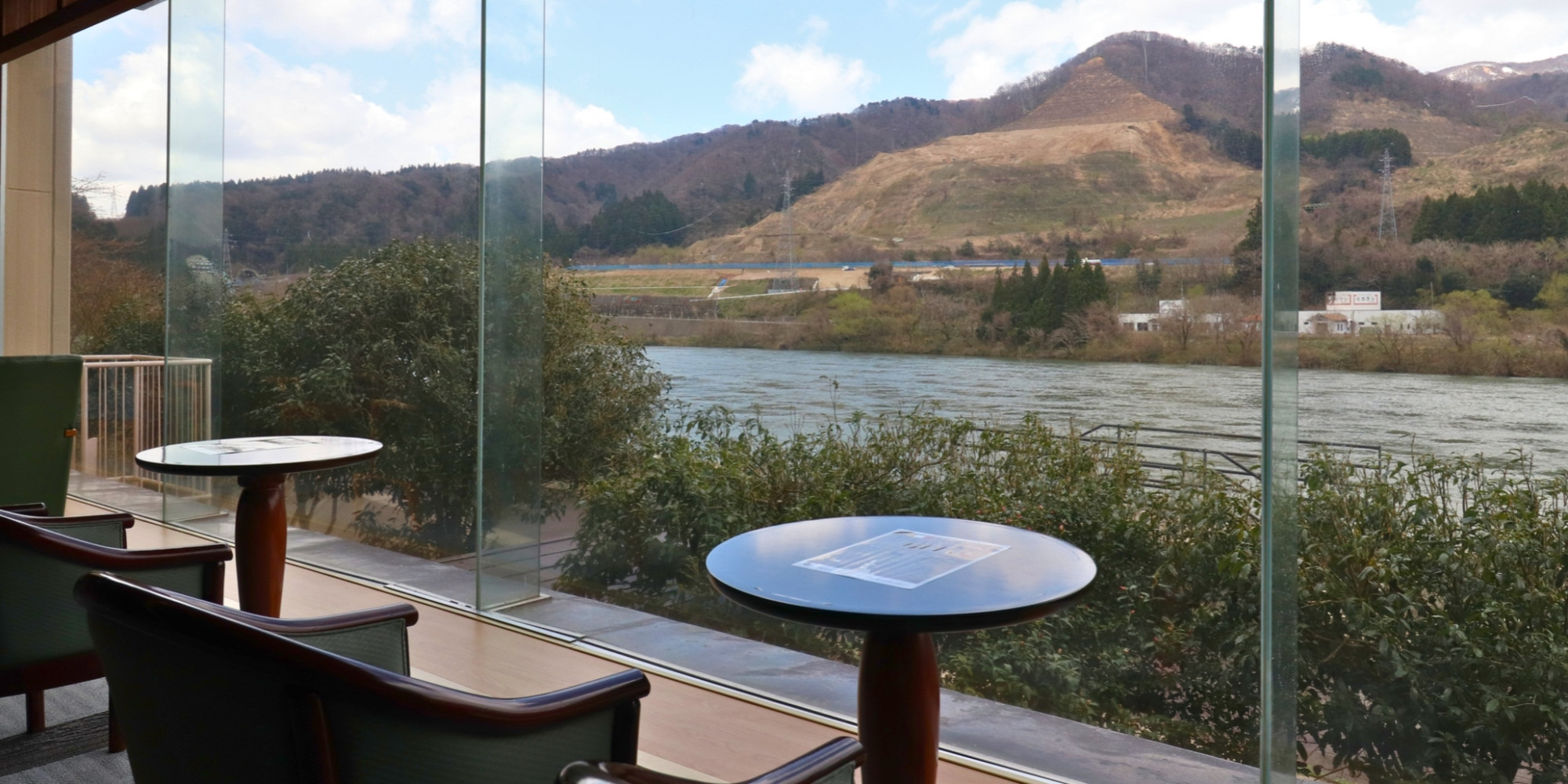 大きな窓からは、悠々たる阿賀野川の流れ。