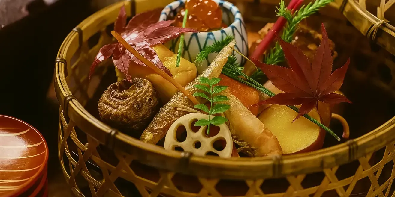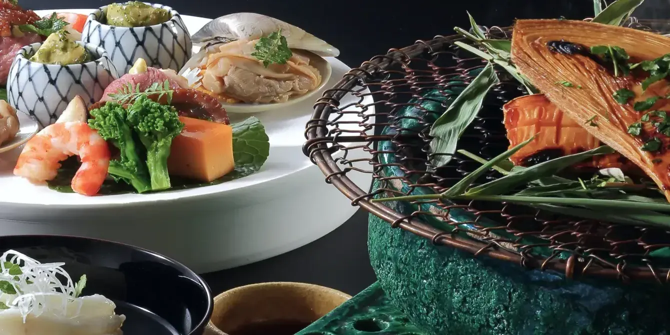 夕べには、地の恵みを映した懐石料理を。ゆるやかな時間が、夜の帳へと溶けてゆきます。