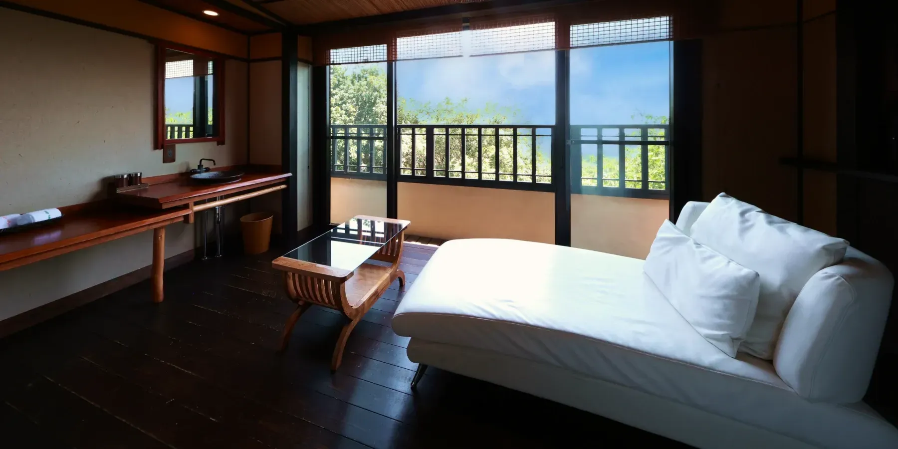 風が通り抜ける寝室と、テラス付き内風呂が旅の疲れを癒します。