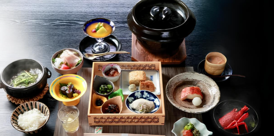 名物「鮑の餡かけ」や、朝食時間に合わせて土釜で炊き上げる「ご飯」など、