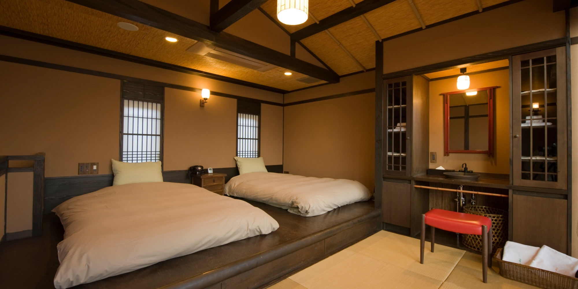 大正ロマンをモチーフにデザインされた建物は、アンティークランプがおぼろげに灯り、お部屋には漆塗りのテーブルや黒電話など、懐かしさとともに生活の中の美が宿るものが置かれています。