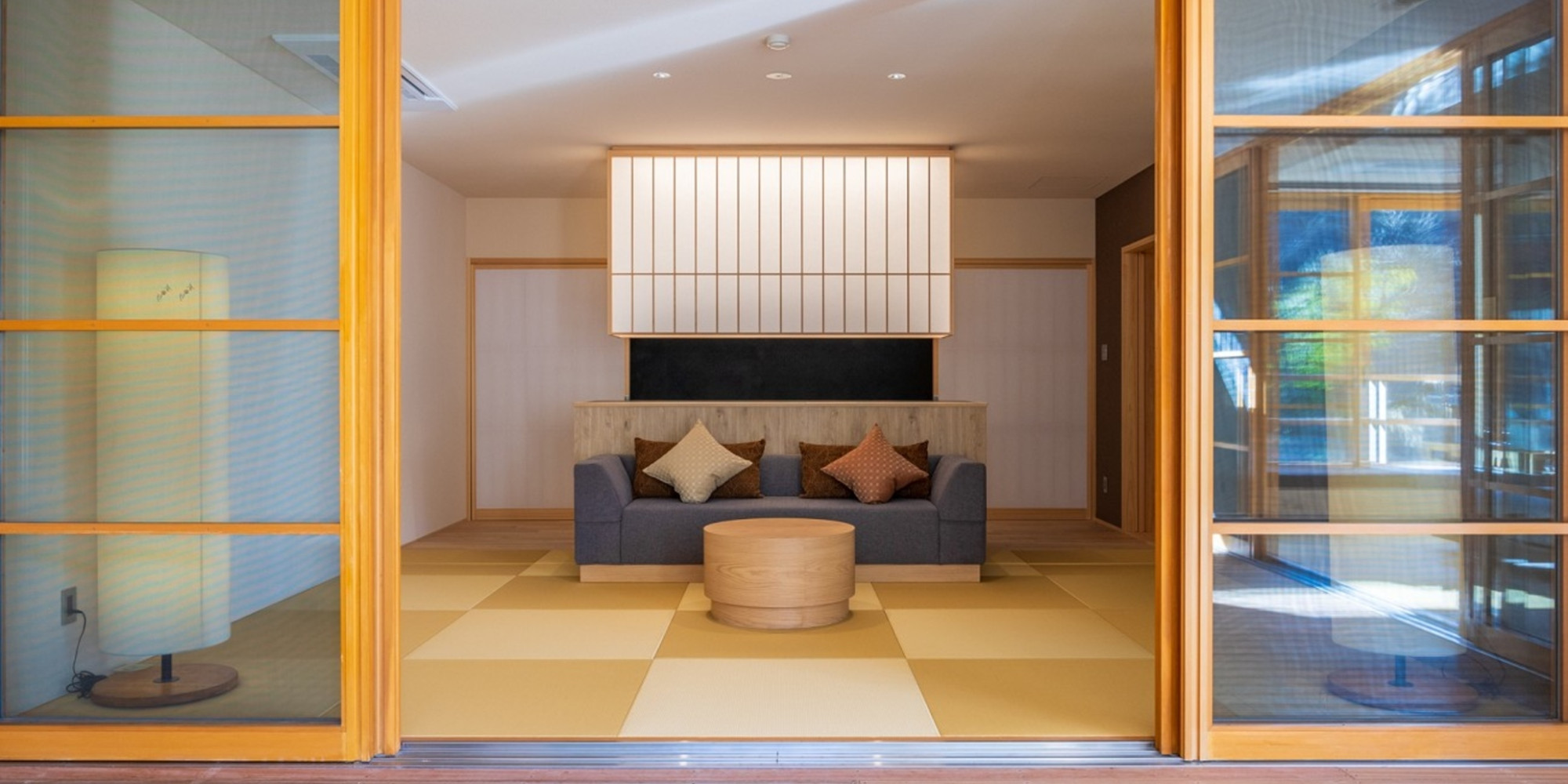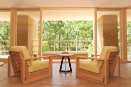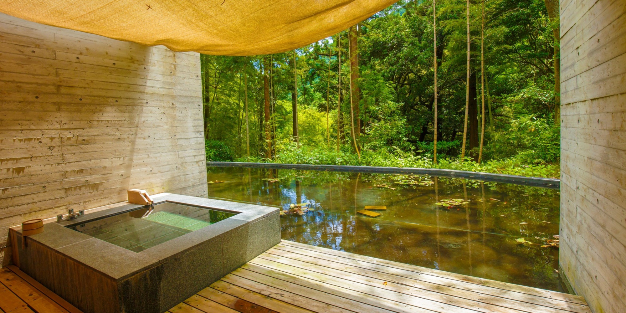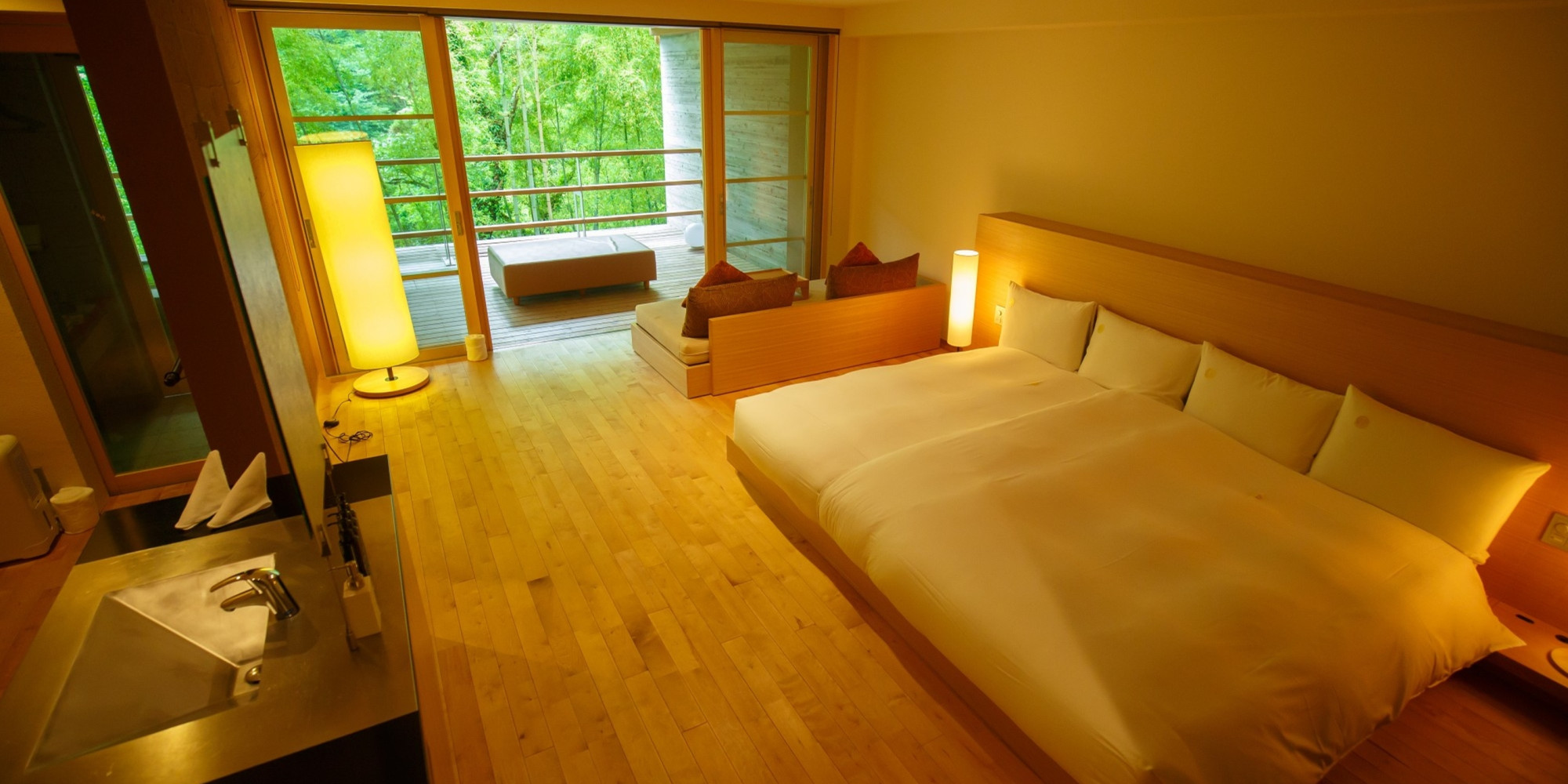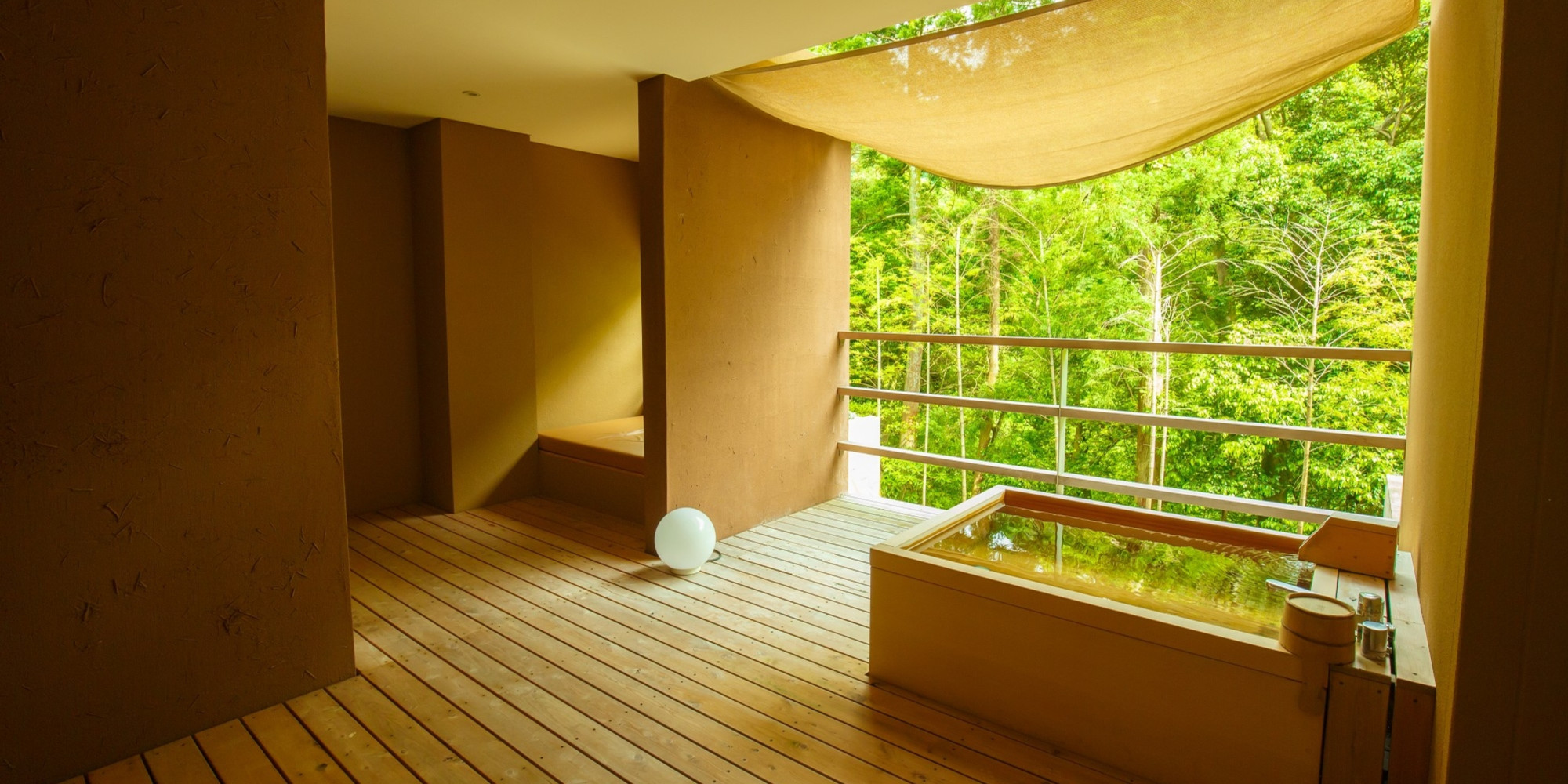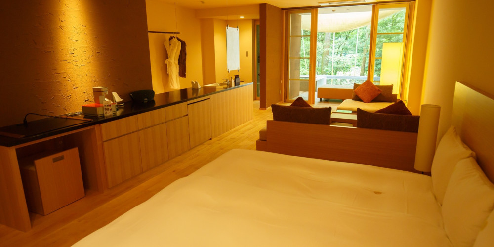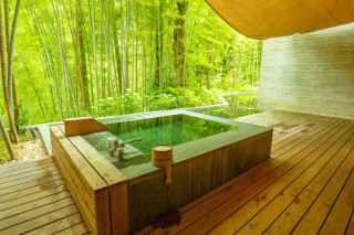 全てのお部屋は、仕切りが少なく森と一体になるようなテラス・自家源泉かけ流し露天風呂付。