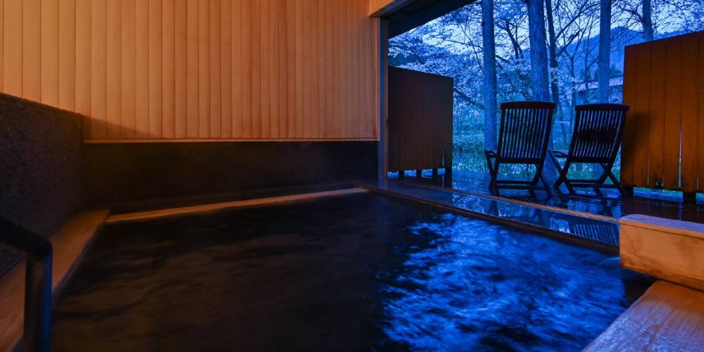 清流沿いの貸切露天風呂。清謐な時の流れに身を委ねる癒やしのひと時。