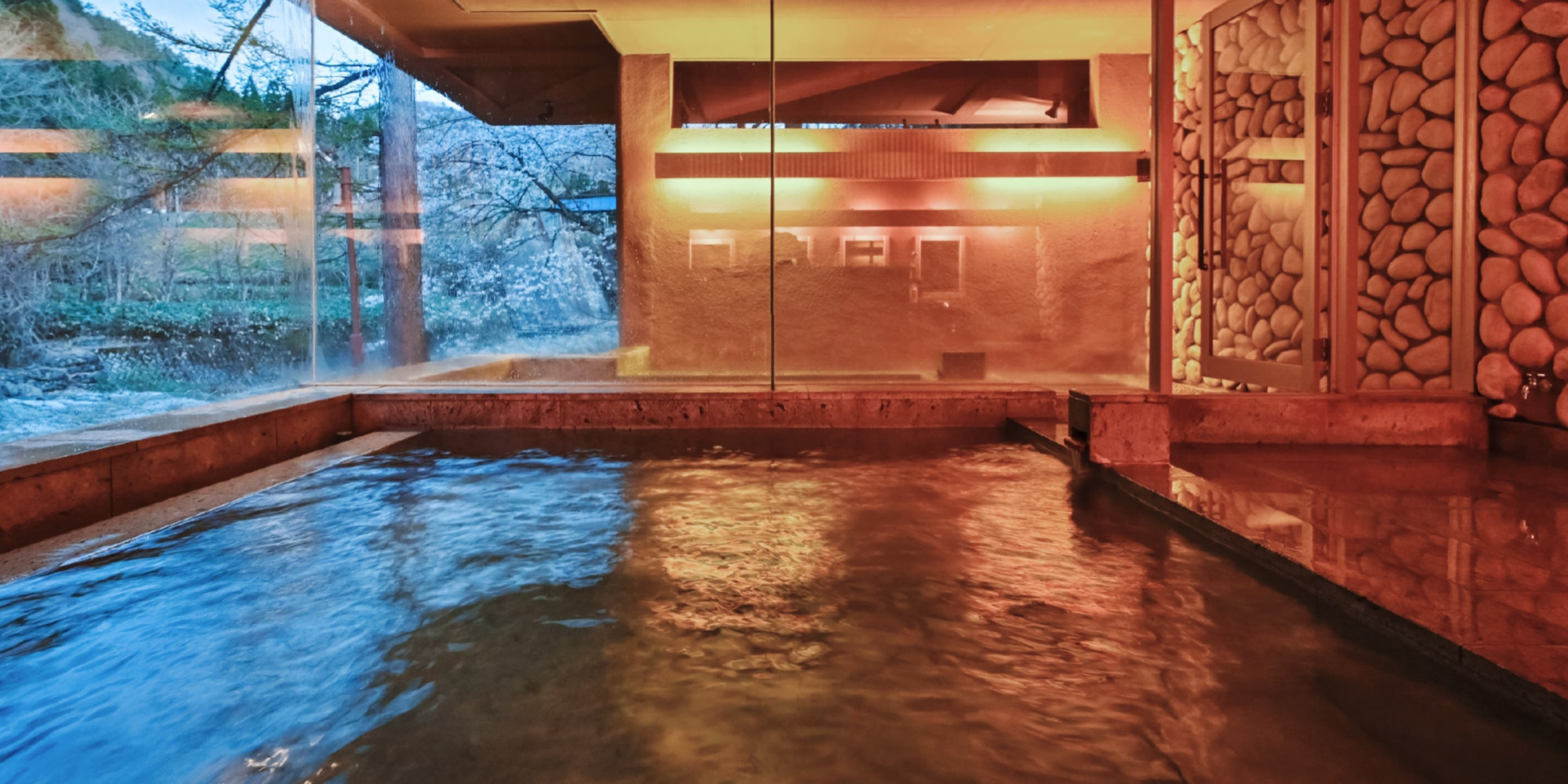 四季折々の移りゆく自然の彩をお楽しみいただけます。川のせせらぎが心地良い、清流に面した露天風呂。