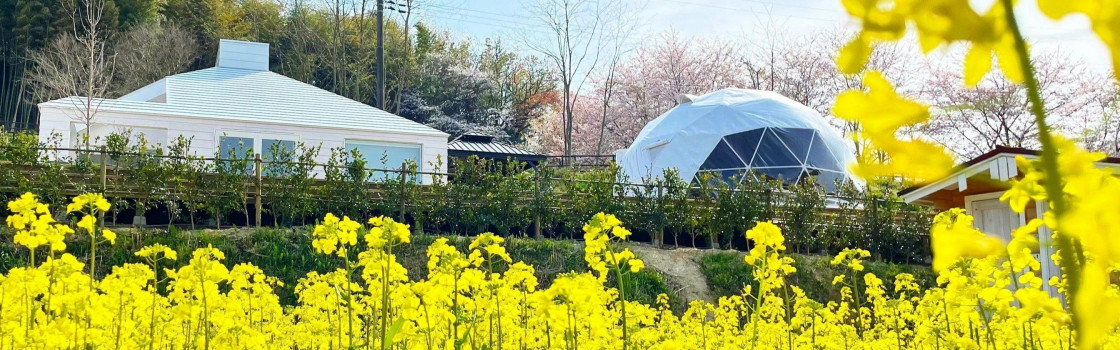 2022年10月にグランドオープンしたグランピングガーデン&ヴィラは900平米を超える敷地の中にある温泉露天風呂とバレルサウナが付いた2階建てヴィラや泊まれるドーム型テントを独り占め。